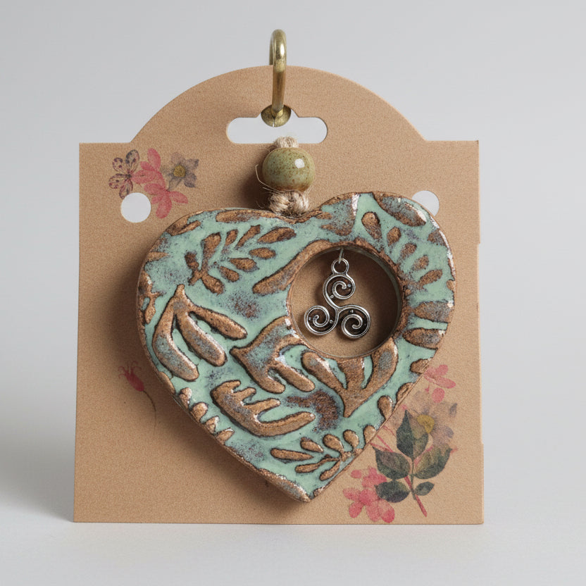 These handmade ceramic decorations are crafted with care and painted by hand, each one featuring a heart-shaped design with embossed leaf patterns and a symbolic centre - spirals, crosses, or other meaningful motifs. Finished with beads and natural string, they’re perfect as ornaments, keepsakes, or thoughtful gifts.